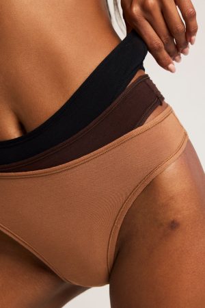 A perfect 3 pack featuring Fawn. Espresso. and Black. High cut in the thigh. cheeky bum. mid-rise front. Hello. instant elongation.