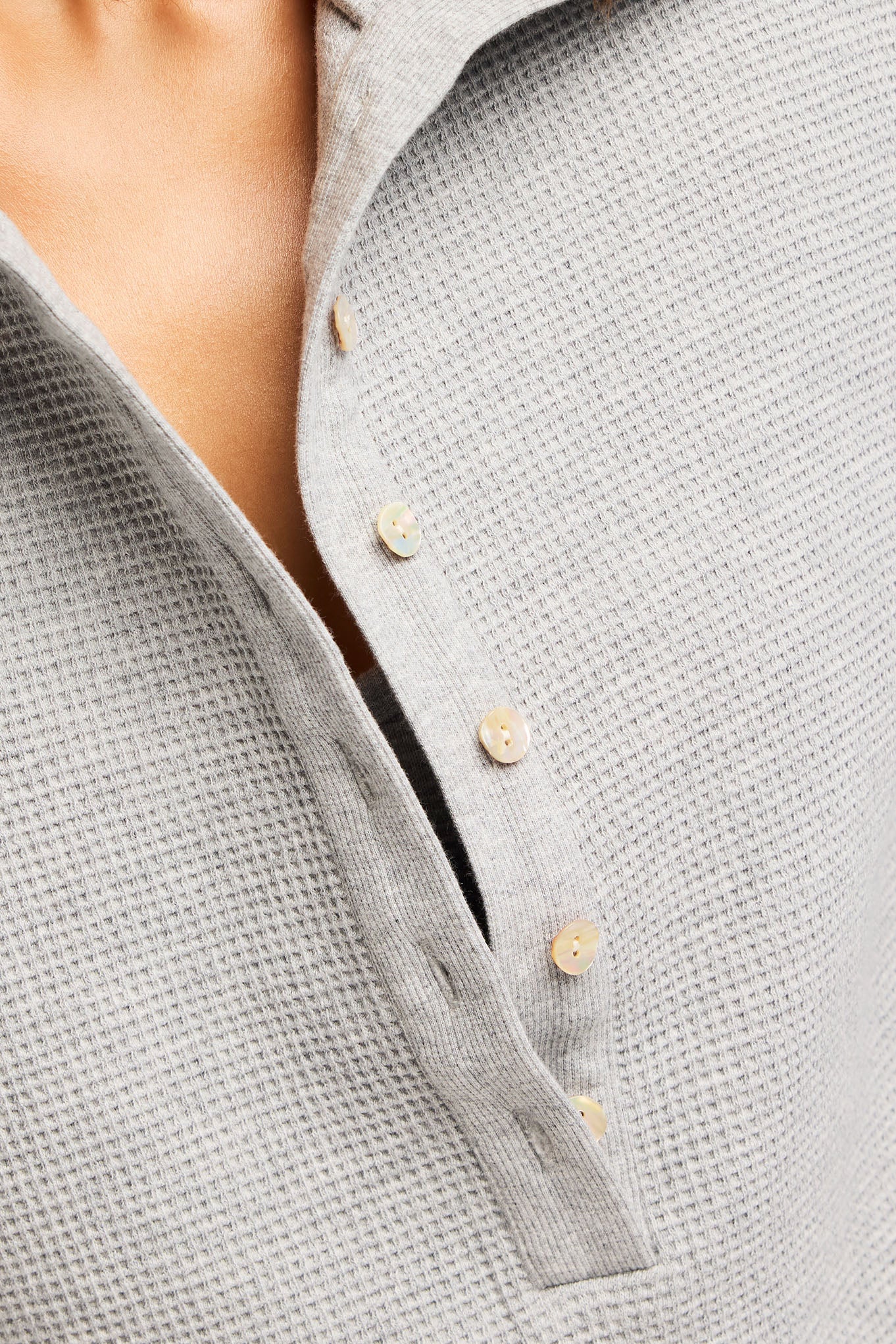 Country club meets cozy boyfriend. A slouchy pullover with a deep rib collar and mother-of-pearl buttons. in a luxuriously cozy ultra plush cotton waffle jacquard.